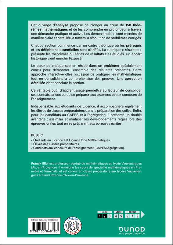 Cet ouvrage d’analyse propose de plonger au coeur de 150 théorèmes mathématiques et de les comprendre en profondeur à travers une démarche pratique et active. Les démonstrations sont menées de manière claire et détaillée, à travers la résolution de problèmes corrigés.