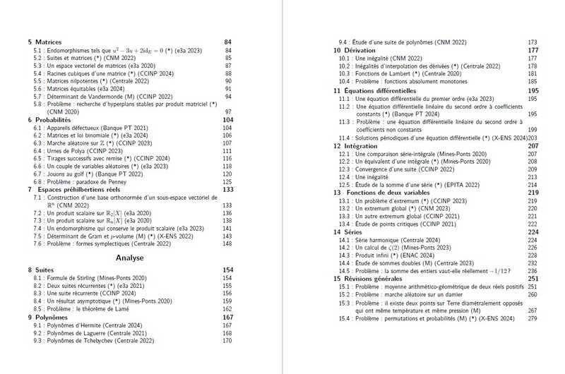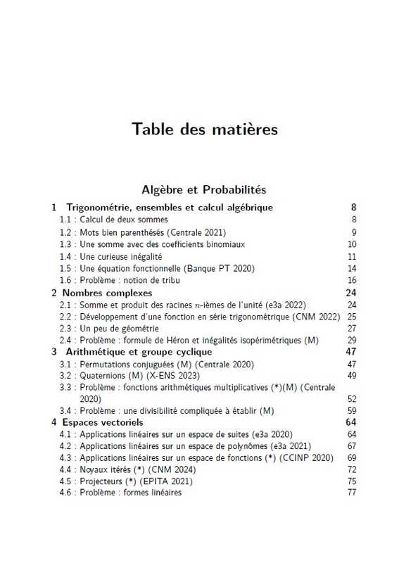 Les sujets retenus couvrent le programme de 1re année des différentes filières (MPSI-MP2I-PCSI-PTSI), seule la géométrie spécifique à la filière PTSI n’est pas traitée. Ils proviennent en majorité des concours Polytechnique-Écoles normales supérieures (X-ENS), Centrale-Supélec, Mines-Ponts, CCINP (Concours commun INP), CNM, Banque PT, e3a-Polytech, EPITA et ENAC.
