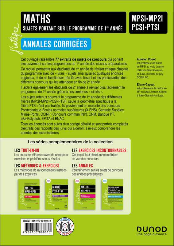 Les sujets retenus couvrent l’intégralité du programme de mathématiques de 1re année des différentes filières (MPSI, MP2I, PCSI, PTSI). Ils proviennent des concours Polytechnique/Écoles normales supérieures (X/ENS), CentraleSupélec, Mines-Ponts, Concours commun INP (CCINP) et e3a Polytech pour certains et de sujets originaux des auteurs pour d'autres.