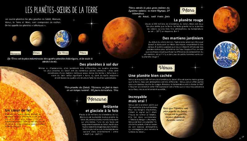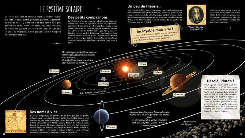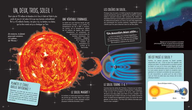 l’origine de l’Univers, la Terre et ses caractéristiques, le Soleil, le Système solaire, la Lune, les astéroïdes, les comètes et les étoiles filantes, la vie des étoiles,