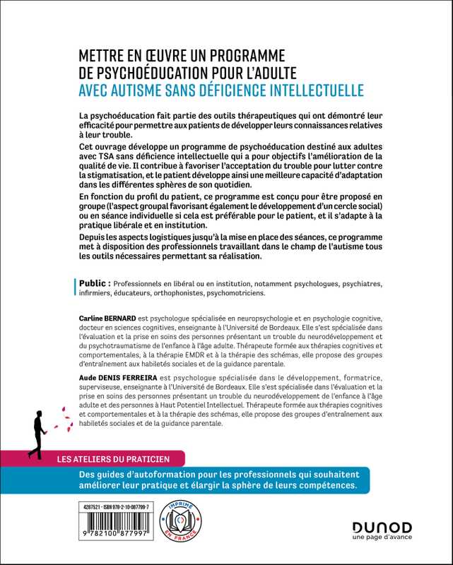 Cet ouvrage développe un programme de psychoéducation destiné aux adultes avec TSA sans déficience intellectuelle qui a pour objectifs l’amélioration de la qualité de vie. Il contribue à favoriser l’acceptation du trouble pour lutter contre la stigmatisation, et le patient développe ainsi une meilleure capacité d’adaptation dans les différentes sphères de son quotidien.