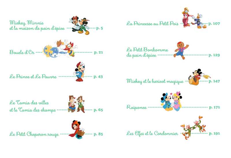 Contient les histoires : Mickey, Minnie et la maison de pain d’épice / Boucle d’Or / Le Prince et Le Pauvre / Le Tamia des villes et le Tamia des champs / Le Petit Chaperon rouge / La Princesse au Petit Pois / Le Petit Bonhomme de pain d’épice / Mickey et le haricot magique / Raiponce / Les Elfes et le Cordonnier