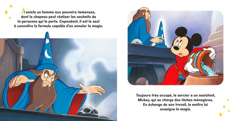 L’histoire : Apprenti du puissant sorcier Yensid, Mickey est chargé de le seconder, notamment en s’occupant des tâches ménagères. Poussé par son désir de pratiquer à son tour la magie, Mickey vole un jour le chapeau de son maître en son absence. Mais gare à celui qui veut devenir sorcier sans savoir en contrôler les pouvoirs ! Mickey va lancer des sorts qu’il ne saura pas annuler…
