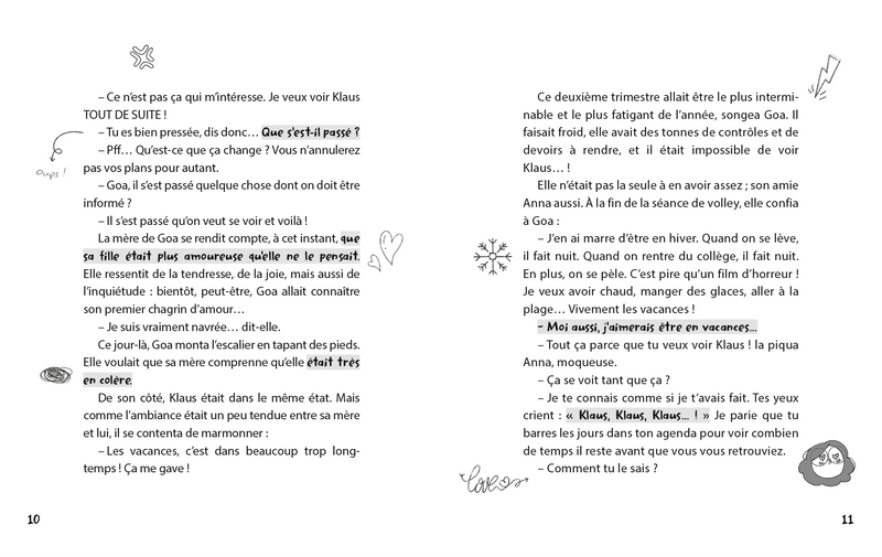 « Comment autant de choses peuvent-elles arriver en si peu de temps ? J’ai tellement hâte de revoir Klaus. Anna et Laura, mes copines, rivalisent de maladresse. Nadia, elle, peine à trouver sa place dans sa nouvelle école…