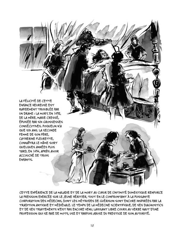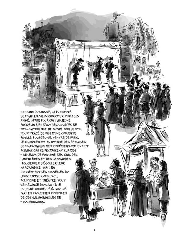 Pour éclairer sa vie, un retour aux sources s’impose, dans le quartier des Halles en 1622, et plus précisément au « Pavillon des singes ». Jean-Baptiste Poquelin naît dans une famille bourgeoise. Il regimbe à reprendre la charge paternelle de tapissier du Roi et rejoint la famille Béjart pour se lancer dans une audacieuse entreprise théâtrale. La troupe connaît ses premiers succès en province, avant de faire un retour triomphal à Paris, où Molière se révèle à la fois comme auteur dramatique talentueux, directeur de troupe avisé, organisateur des divertissements de la cour et artiste favori de Louis XIV, avec Lully. Amis, ennemis, succès et échecs jalonnent dès lors son existence placée sous le signe du scandale, jusqu'à sa mort sans cérémonie. Le prologue nous entraîne vers une salle de classe, sous la Troisième République, et l’épilogue extrapole sur quatre siècles de célébrations. Une façon de montrer, s’il est encore besoin, la modernité inégalable de Molière. Un roman graphique passionnant sur la vie et l'œuvre du plus grand auteur de théâtre français.