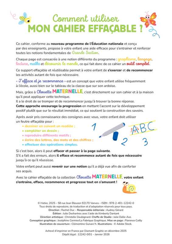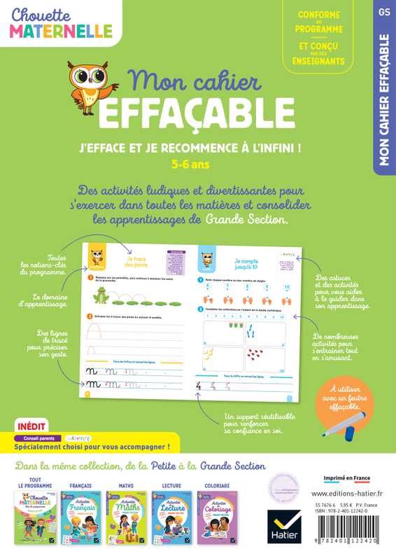 Apprends en t'amusant grâce à ce cahier effaçable Chouette Maternelle conçu par des enseignants ! Trace, efface, recommence et progresse dans tous les domaines d'apprentissage du nouveau programme de la maternelle : Graphisme, Maths, Langage, Lecture, Découvrir le monde et Se repérer dans le temps et l'espace.