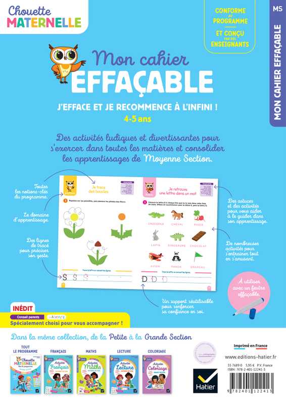 Apprends en t'amusant grâce à ce cahier effaçable Chouette Maternelle conçu par des enseignants ! Trace, efface, recommence et progresse dans tous les domaines d'apprentissage du nouveau programme de la maternelle : Graphisme, Maths, Langage, Lecture, Découvrir le monde et Se repérer dans le temps et l'espace.