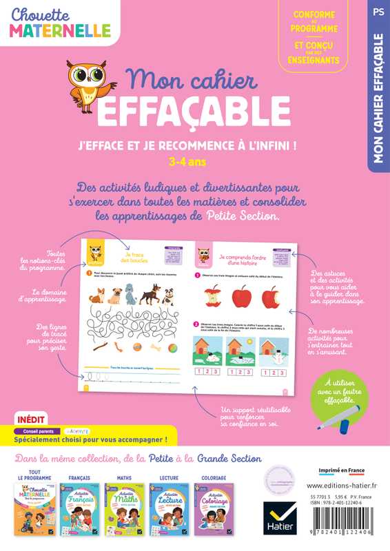 Apprends en t'amusant grâce à ce cahier effaçable Chouette Maternelle conçu par des enseignants ! Trace, efface, recommence et progresse dans tous les domaines d'apprentissage du nouveau programme de la maternelle : Graphisme, Maths, Langage, Lecture, Découvrir le monde et Se repérer dans le temps et l'espace.