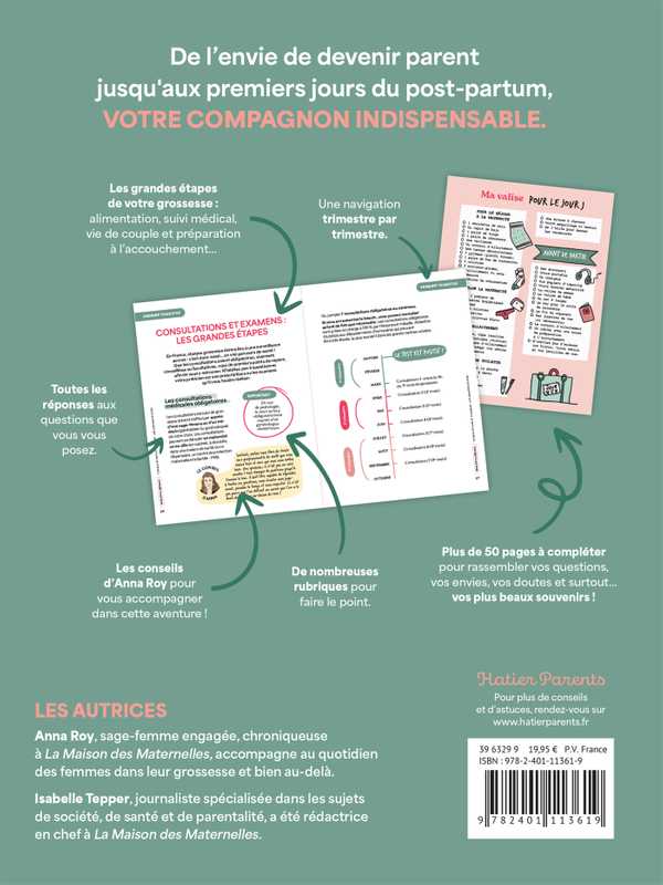 Dans ce livre-carnet, vous aurez toutes les informations nécessaires pour vivre votre grossesse de façon saine et sereine, mais également des pages à remplir pour y consigner petits et grands moments, prendre note de vos émotions et recueillir vos souvenirs tout au long de cette période si spéciale.