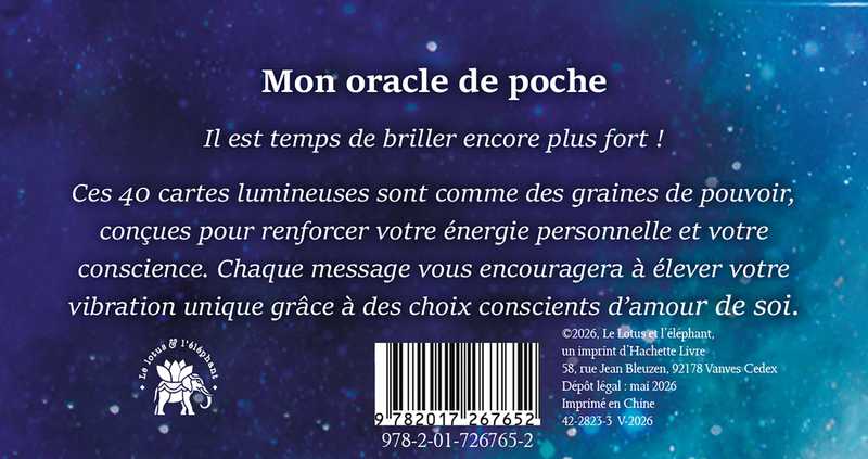 Il est temps de briller encore plus fort ! Ces 40 cartes lumineuses sont comme des graines de pouvoir, conçues pour renforcer votre énergie personnelle et votre conscience. Chaque message vous encouragera à élever votre vibration unique grâce à des choix conscients d’amour de soi .