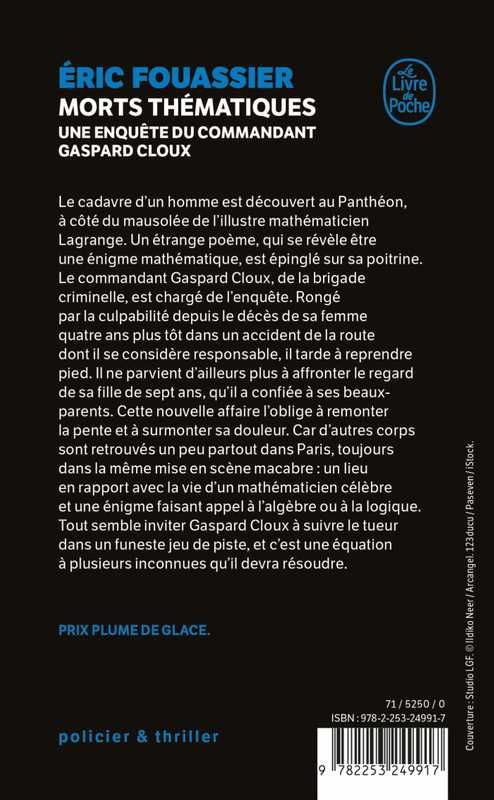 Le cadavre d’un homme est découvert au Panthéon, à l’extérieur d’un mausolée, celui de l’illustre mathématicien Lagrange. Un étrange poème, qui se révèle être une énigme mathématique, est épinglé sur sa poitrine. Le commandant Gaspard Cloux, de la brigade criminelle, est chargé de l’enquête. Rongé par la culpabilité depuis le décès de sa femme quatre ans plus tôt dans un accident de la route dont il se considère responsable, il tarde à reprendre pied. Il ne parvient d’ailleurs plus à affronter le regard de sa fille de sept ans, qu’il a confiée à ses beaux-parents. Cette nouvelle affaire l’oblige à remonter la pente et à surmonter sa douleur. Car d’autres corps sont retrouvés un peu partout dans Paris, toujours dans la même mise en scène macabre : un lieu en rapport avec la vie d’un mathématicien célèbre et une énigme faisant appel à l’algèbre ou à la logique. Tout semble inviter Gaspard Cloux à suivre le tueur dans un funeste jeu de piste, et c’est une équation à plusieurs inconnues qu’il devra résoudre.
