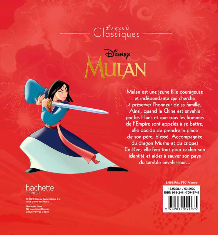 L’histoire : Au cœur de la Chine Impériale vit Mulan, une jeune femme intrépide. Alors que les Huns s’apprêtent à envahir l’Empire, Mulan s’engage dans l’armée pour sauver son père d’une mort certaine. Se faisant passer pour un homme, elle part à l’aventure en compagnie de ses fidèles alliés, Mushu et Cri-Kee.