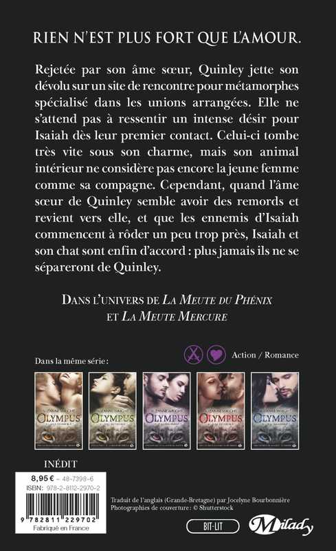 Rejetée par son âme soeur, Quinley jette son dévolu sur un site de rencontre pour métamorphes, spécialisé dans les unions arrangées. Elle ne s'attend pas à ressentir un intense désir pour Isaiah dès leur premier contact. Celui-ci tombe très vite sous le charme, mais son animal intérieur ne considère pas encore la jeune femme comme sa compagne. Cependant, quand l'âme soeur de Quinley semble avoir des remords et revenir vers elle, et que les ennemis d'Isaiah commencent à rôder un peu trop près, Isaiah et son chat sont enfin d'accord : plus jamais ils ne se sépareront de Quinley.