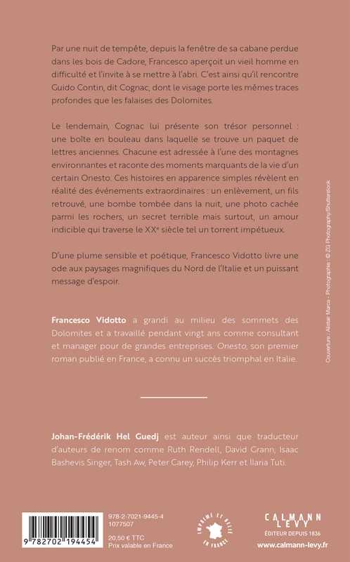 Le lendemain, Cognac lui présente son trésor personnel : une boîte en bouleau dans laquelle se trouve un paquet de lettres anciennes. Chacune est adressée à l’une des montagnes environnantes et raconte des moments marquants de la vie d’un certain Onesto. Ces histoires en apparence simples révèlent en réalité des événements extraordinaires : un enlèvement, un fils retrouvé, une bombe tombée dans la nuit, une photo cachée parmi les rochers, un secret terrible mais surtout, un amour indicible qui traverse le XXe siècle tel un torrent impétueux.