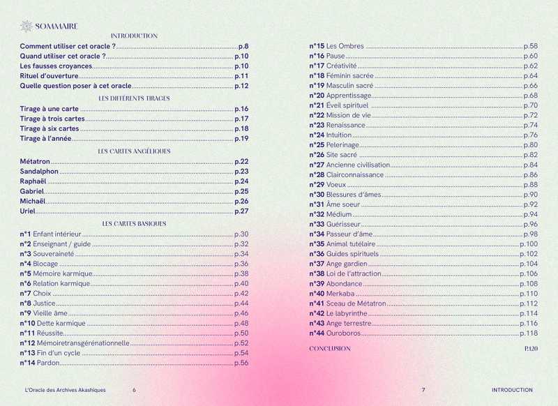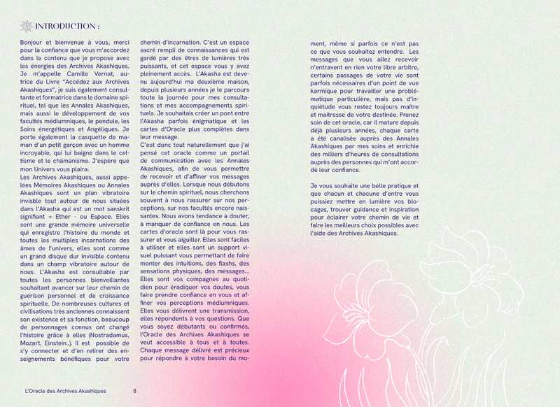 Cet oracle, accompagné d'un guide pratique, offre un accès aux Archives Akashiques pour mieux comprendre sa vie, guérir ses blessures et se libérer du karma. Grâce à un protocole clair, il enseigne comment se connecter aux Archives, poser les bonnes questions, interpréter les réponses, et même consulter pour autrui. Des séances guidées enrichissent l'expérience pour développer ses capacités spirituelles. Camille Vernat, thérapeute certifiée, accompagne ce voyage intérieur.