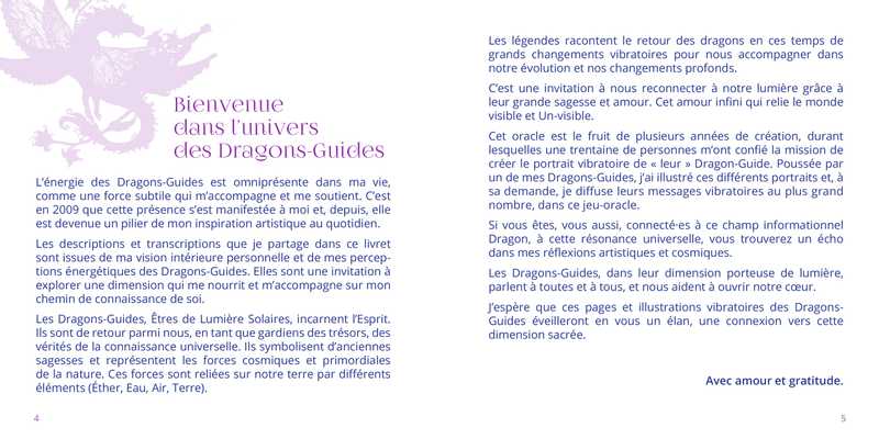 Ce coffret contient 38 cartes vibratoires illustrées accompagnées d'un livret de 128 pages, contenant les messages et protocoles de connexion aux Dragons-Guides.