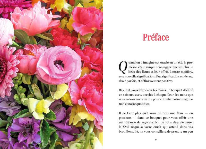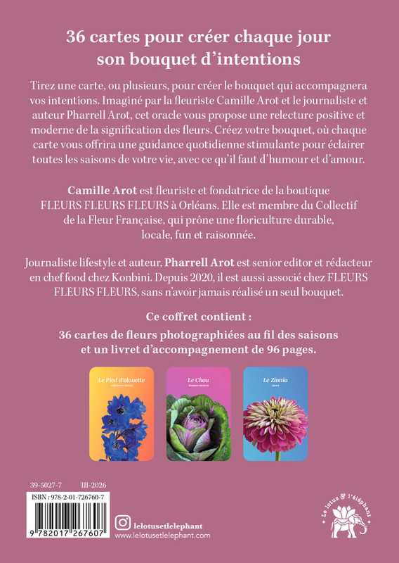 Tirez une carte, ou plusieurs, pour créer le bouquet qui accompagnera vos intentions. Imaginé par la fleuriste Camille Arot et le journaliste et auteur Pharrell Arot, cet oracle vous propose une relecture positive et moderne de la signification des fleurs. Créez votre bouquet, où chaque carte vous offrira une guidance quotidienne stimulante pour éclairer toutes les saisons de votre vie, avec ce qu’il faut d’humour et d’amour.