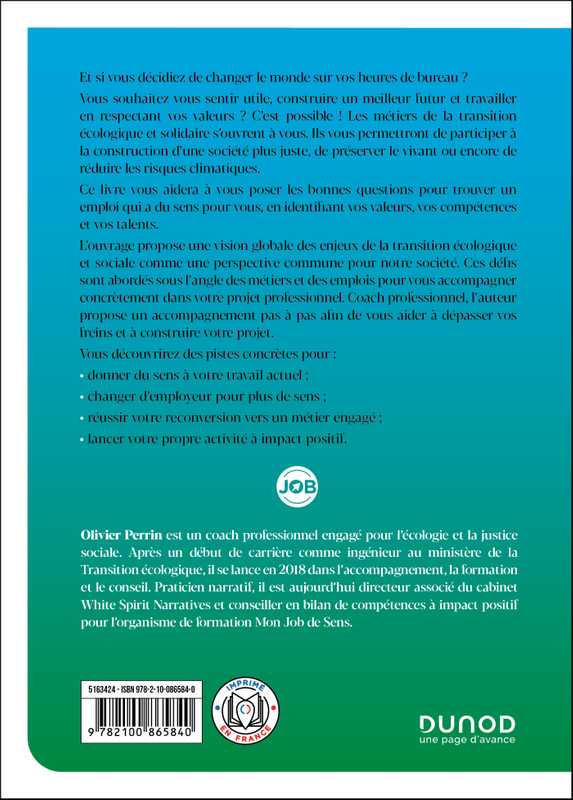 L’ouvrage propose une vision globale des enjeux de la transition écologique et sociale comme une perspective commune pour notre société. Ces défis sont abordés sous l’angle des métiers et des emplois pour vous accompagner concrètement dans votre projet professionnel. Coach professionnel, l’auteur propose un accompagnement pas à pas afin de vous aider à dépasser vos freins et à construire votre projet.