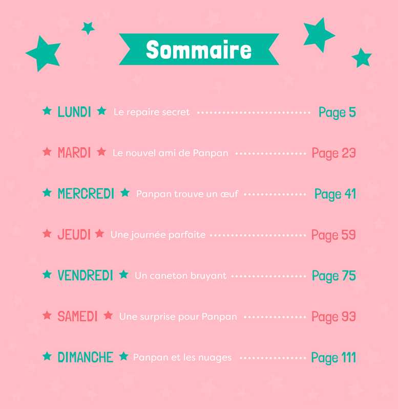 Contient les histoires : Le repaire secret / Le nouvel ami de Panpan / Panpan trouve un œuf / Une journée parfaite / Un caneton bruyant / Une surprise pour Panpan / Panpan et les nuages