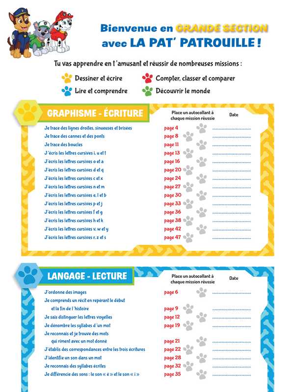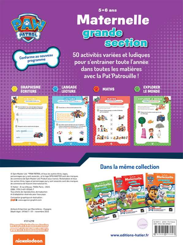 Un cahier d'activités en langage, lecture, graphisme, écriture, maths, explorer le monde pour découvrir tout le programme de grande section avec la Pat'Patrouille ! Avec des autocollants