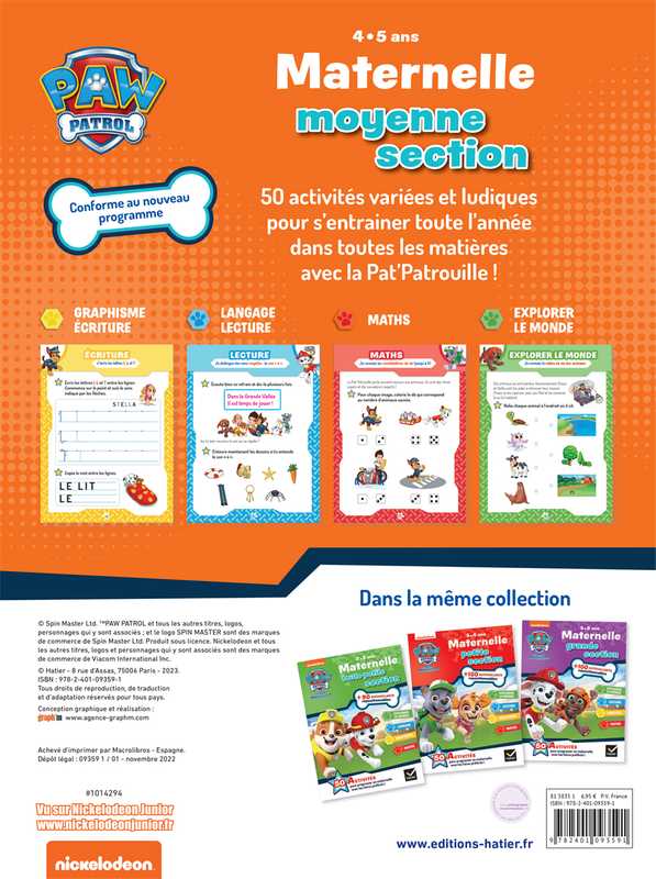 Un cahier d'activités en langage, lecture, graphisme, écriture, maths, explorer le monde pour découvrir tout le programme de moyenne section avec la Pat'Patrouille ! Avec des autocollants