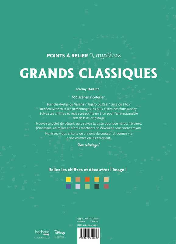 Blanche-Neige ou Vaiana ? Figaro ou Kaa ? Luca ou Lilo ? Redécouvre tous les personnages les plus cultes des films Disney. Suis les chiffres et relie les points un à un pour faire apparaître 100 dessins originaux.
