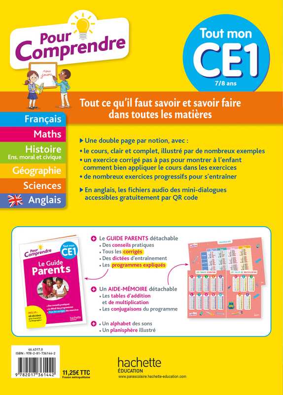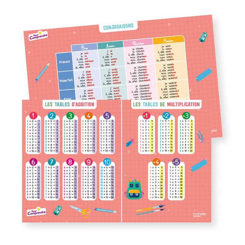 + un aide-mémoire pour connaître les tables de multiplication, les tables d’addition et toutes les conjugaisons au programme
