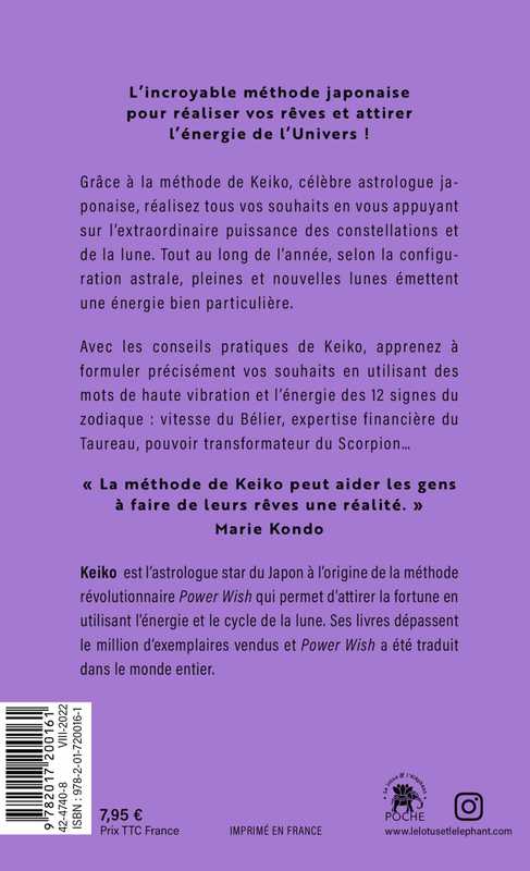 Grâce à la méthode de Keiko, célèbre astrologue japonaise, réalisez tous vos souhaits en vous appuyant sur l’extraordinaire puissance des constellations et de la lune. Tout au long de l’année, selon la configuration astrale, pleines et nouvelles lunes émettent une énergie bien particulière.