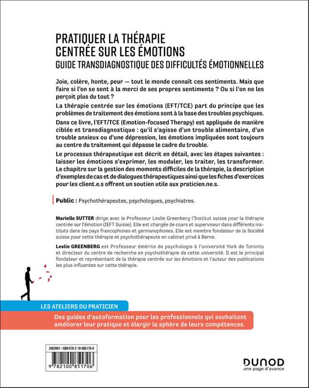 Le processus thérapeutique est décrit en détail, avec les étapes suivantes : laisser les émotions s’exprimer, les moduler, les traiter, les transformer. Le chapitre sur la gestion des moments difficiles de la thérapie, la description d’exemples de cas et de dialogues thérapeutiques ainsi que les fiches d’exercices pour les client.e.s offrent un soutien utile aux praticien.ne.s.