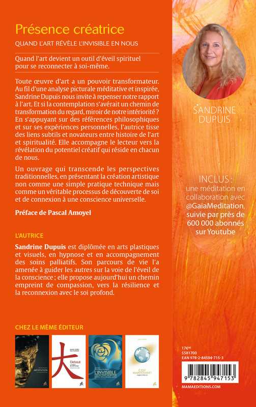 Toute œuvre d’art a un pouvoir transformateur. Au fil d’une analyse picturale méditative et inspirée, Sandrine Dupuis nous invite à repenser notre rapport à l’art. Et si la contemplation s’avérait un chemin de transformation du regard, miroir de notre intériorité ? En s’appuyant sur des références philosophiques et sur ses expériences personnelles, l’autrice tisse des liens subtils et novateurs entre histoire de l’art et spiritualité. Elle accompagne le lecteur vers la révélation du potentiel créatif qui réside en chacun de nous.