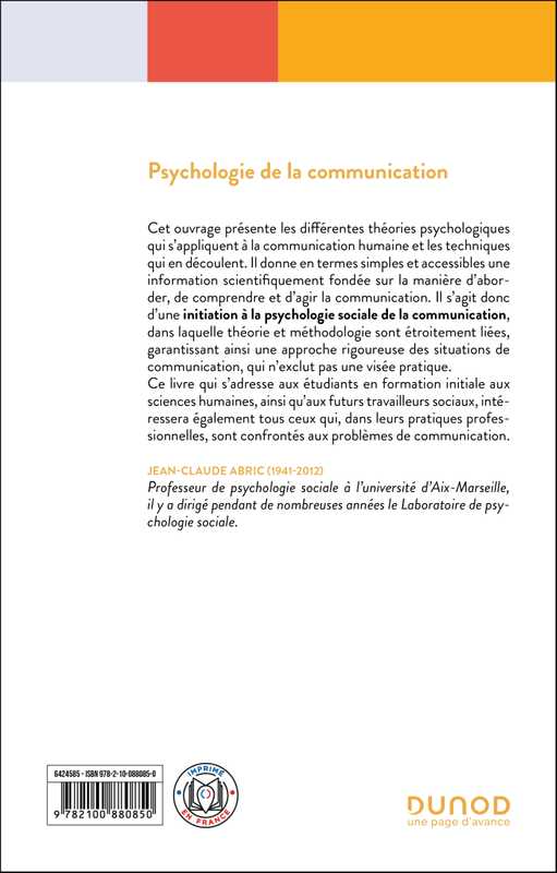 Cet ouvrage présente les différentes théories psychologiques qui s’appliquent à la communication humaine et les techniques qui en découlent. Il donne en termes simples et accessibles une information scientifiquement fondée sur la manière d’aborder, de comprendre et d’agir la communication. Il s’agit donc d’une initiation à la psychologie sociale de la communication, dans laquelle théorie et méthodologie sont étroitement liées, garantissant ainsi une approche rigoureuse des situations de communication, qui n’exclut pas une visée pratique.