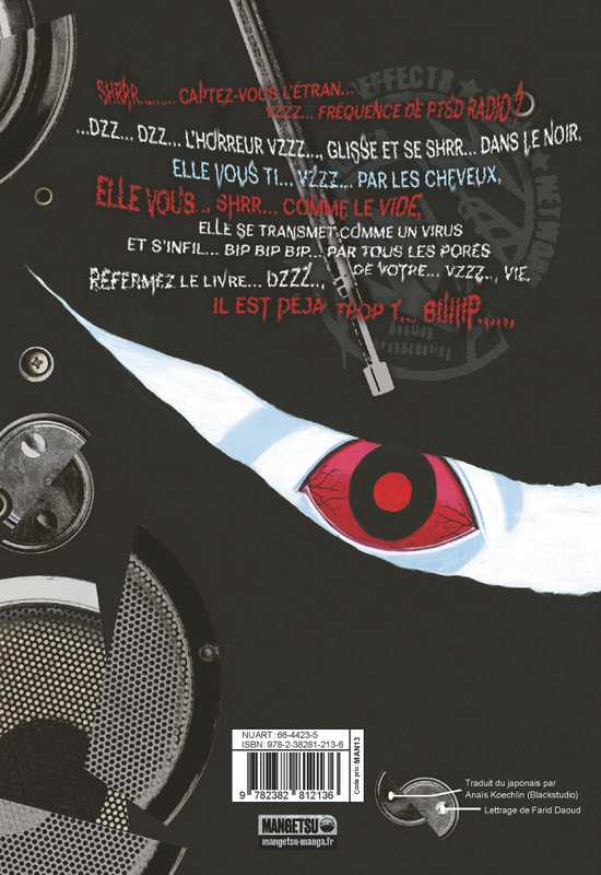 shrrr......... Captez-vous l'étran... vzzz... fréquence de PTSD Radio ? ...dzz... dzz... L'horreur vzzz..., glisse et se shrr... dans le noir. Elle vous ti... vzzz... par les cheveux, elle vous... shrr... comme le vide, elle se transmet comme un virus et s'infil... bip bip bip... par tous les pores de votre... vzzz... vie. Refermez le livre... dzzz... Il est déjà trop t... biiiiip......