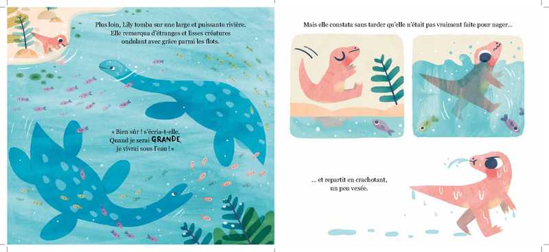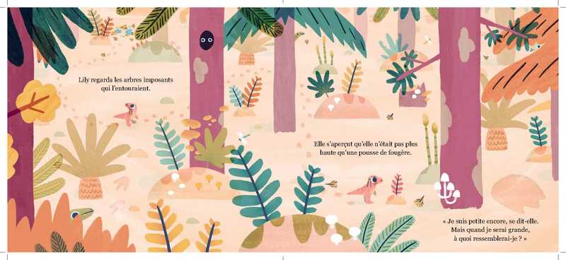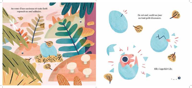 Au cœur d’une ancienne et vaste forêt reposait un œuf solitaire. De cet œuf sortit un jour un tout petit dinosaure. Elle s’appelait Lily. « Je suis petite encore, se dit-elle. Mais quand je serai grande, à quoi ressemblerai-je ? »