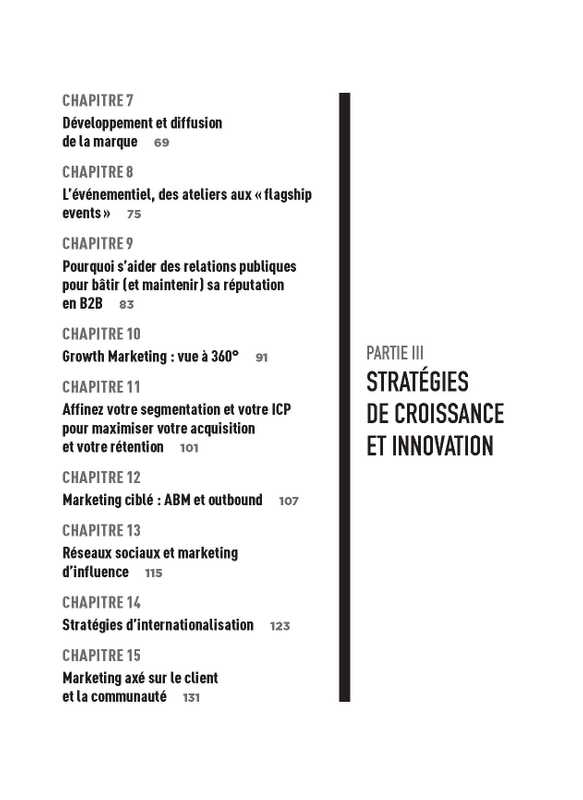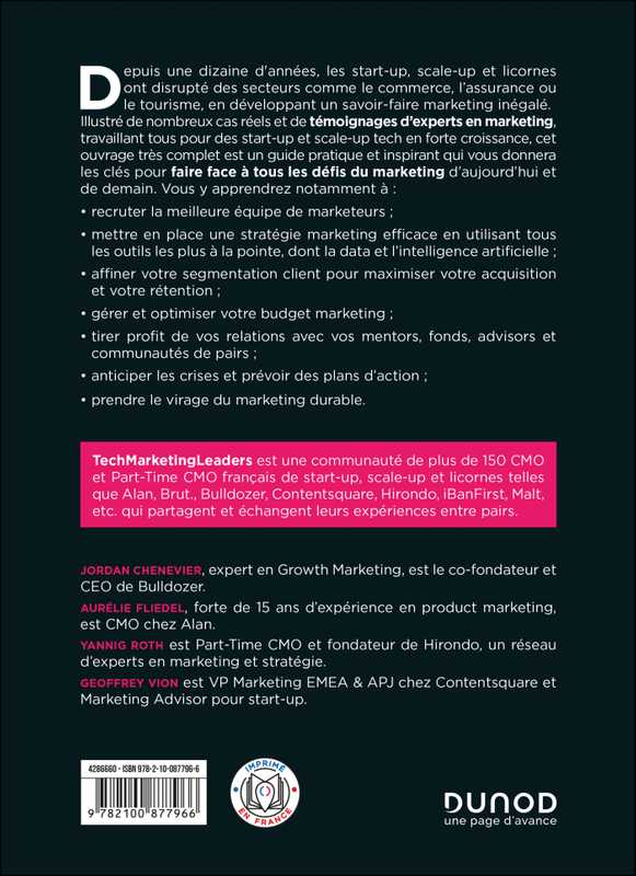 Illustré de nombreux cas réels et de témoignages d’experts en marketing, travaillant tous pour des start-up et scale-up tech en forte croissance, cet ouvrage très complet est un guide pratique et inspirant qui vous donnera les clés pour faire face à tous les défis du marketing d’aujourd’hui et de demain. Vous y apprendrez notamment à :
