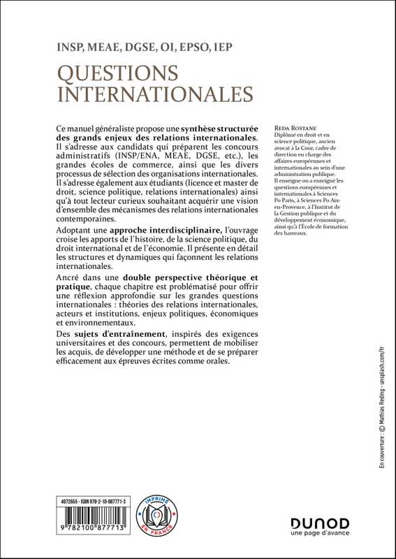 Ce manuel généraliste propose une synthèse structurée des grands enjeux des relations internationales. Il s’adresse aux candidats qui préparent les concours administratifs (INSP/ENA, MEAE, DGSE, etc.), les grandes écoles de commerce, ainsi que les divers processus de sélection des organisations internationales. Il s’adresse également aux étudiants (licence et master de droit, science politique, relations internationales) ainsi qu’à tout lecteur curieux souhaitant acquérir une vision d’ensemble des mécanismes des relations internationales contemporaines.