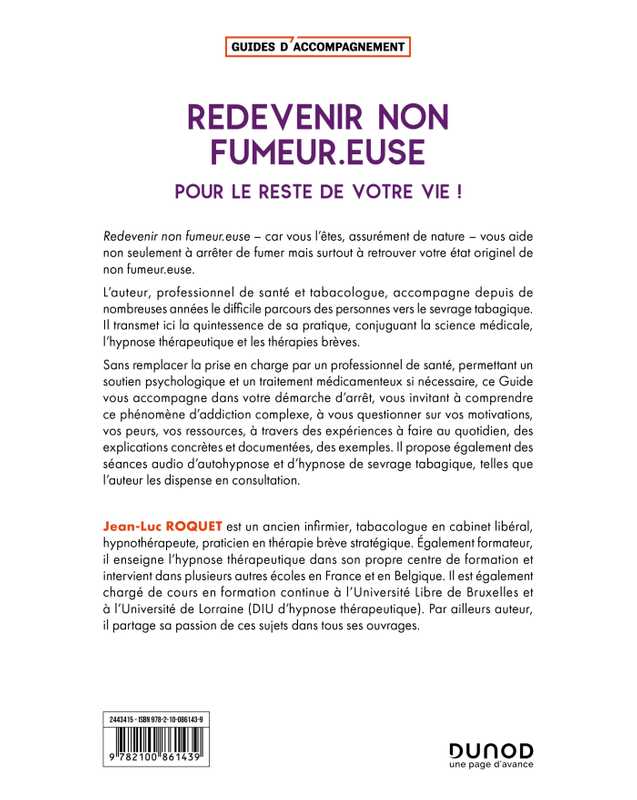 Sans remplacer la prise en charge par un professionnel de santé, permettant un soutien psychologique et un traitement médicamenteux si nécessaire, ce Guide vous accompagne dans votre démarche d’arrêt, vous invitant à comprendre ce phénomène d’addiction complexe, à vous questionner sur vos motivations, vos peurs, vos ressources, à travers des expériences à faire au quotidien, des explications concrètes et documentées, des exemples. Il propose également des séances audio d’autohypnose et d’hypnose de sevrage tabagique, telles que l’auteur les dispense en consultation.