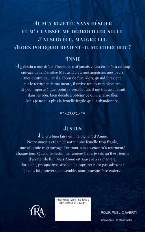 Le destin a une drôle d’ironie. Je n’ai jamais voulu être liée à ce loup sauvage de la Dernière Meute. Il a vu mes angoisses, mes peurs, mes cicatrices… et il a choisi de fuir. Alors, quand il revient sur le territoire de ma meute, il ravive toutes mes blessures. Et peu importe à quel point je veux le fuir, il me traque, me suit dans les bois, bien décidé à obtenir ce qu’il a laissé filer. Mais je ne suis plus la femelle fragile qu’il a abandonnée.