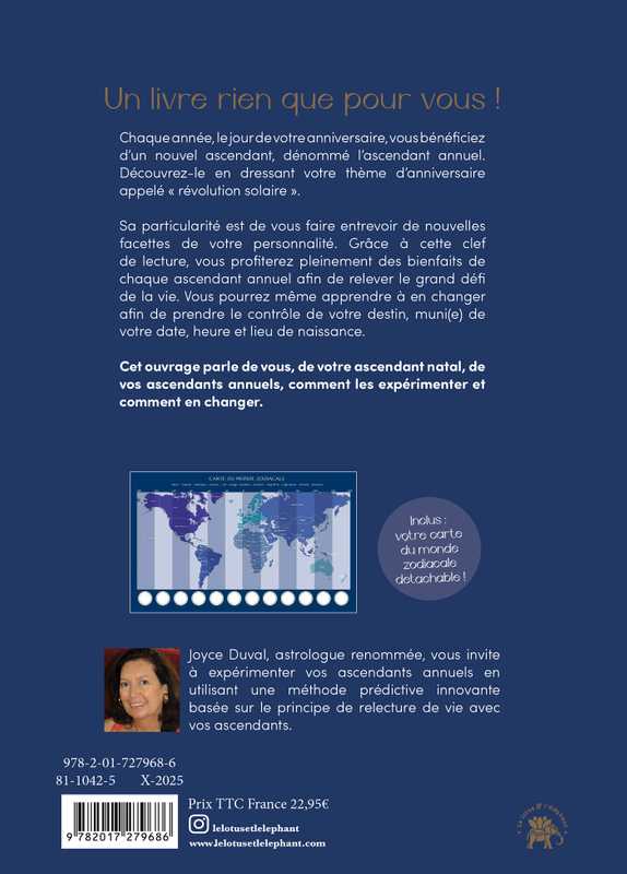Cet ouvrage parle de vous, de votre ascendant natal, de vos ascendants annuels, comment les expérimenter et comment en changer. Inclus : votre carte du monde zodiacale détachable !