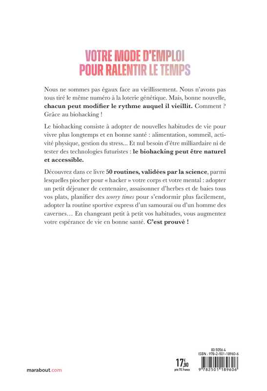 Découvrez dans ce livre 50 routines, validées par la science, parmi lesquelles piocher pour « hacker » votre corps et votre mental : adopter un petit déjeuner de centenaire, assaisonner d’herbes et de baies tous vos plats, planifier des worry times pour s’endormir plus facilement, adopter la routine sportive express d’un samouraï ou d’un homme des cavernes… En changeant petit à petit vos habitudes, vous augmentez votre espérance de vie en bonne santé. C’est prouvé !