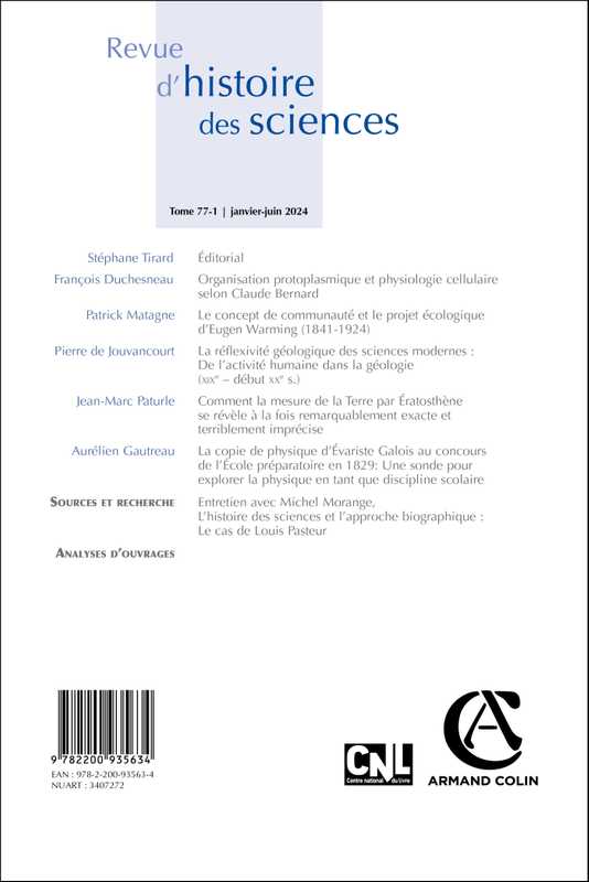 Créée en 1947 par Henri Berr, la Revue d'histoire des sciences est un périodique à comité de lecture. Généraliste dans son domaine, elle traite de l'ensemble des époques et disciplines. Elle est orientée vers l'histoire conceptuelle des sciences mais cependant ouverte à d'autres approches, institutionnelle ou sociologique par exemple. Désormais semestrielle, elle publie, en français ou en anglais, dans des dossiers thématiques ou en varia, des articles présentant les résultats inédits de travaux de recherche en histoire des sciences et épistémologie historique ainsi que des études de synthèse fouillées et documentées sur des points particuliers. Elle a également une vocation documentaire l'amenant à publier éditions et traductions critiques commentées, revues critiques, bibliographies et analyses d'ouvrages.