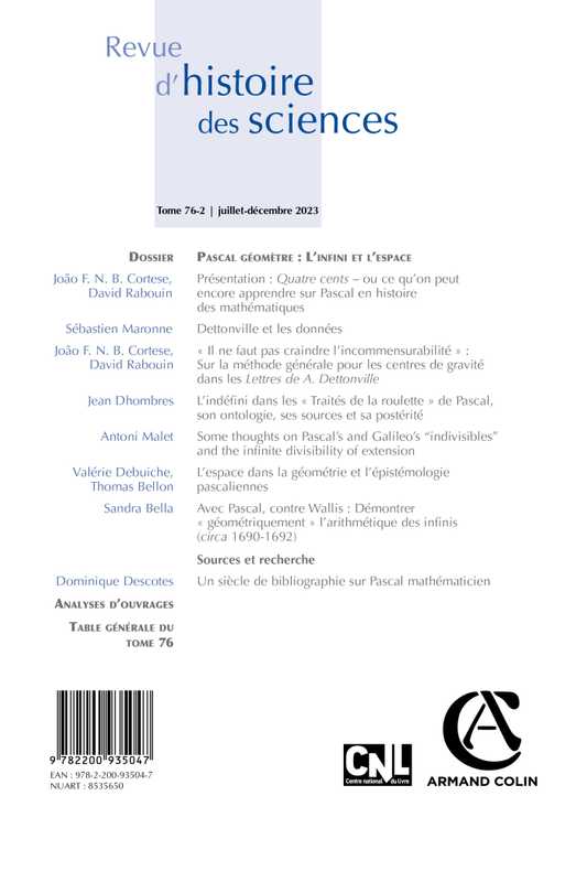Créée en 1947 par Henri Berr, la Revue d'histoire des sciences est un périodique à comité de lecture. Généraliste dans son domaine, elle traite de l'ensemble des époques et disciplines. Elle est orientée vers l'histoire conceptuelle des sciences mais cependant ouverte à d'autres approches, institutionnelle ou sociologique par exemple. Désormais semestrielle, elle publie, en français ou en anglais, dans des dossiers thématiques ou en varia, des articles présentant les résultats inédits de travaux de recherche en histoire des sciences et épistémologie historique ainsi que des études de synthèse fouillées et documentées sur des points particuliers. Elle a également une vocation documentaire l'amenant à publier éditions et traductions critiques commentées, revues critiques, bibliographies et analyses d'ouvrages.
