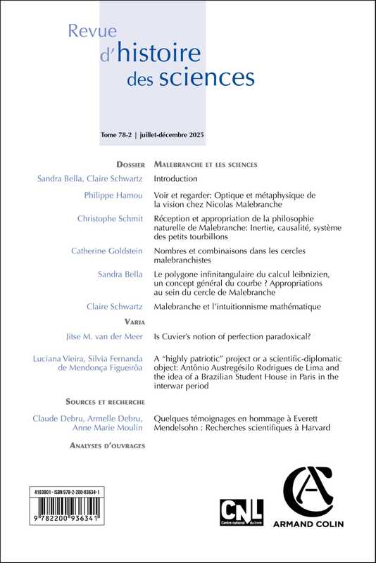 Créée en 1947 par Henri Berr, la Revue d'histoire des sciences est un périodique à comité de lecture. Généraliste dans son domaine, elle traite de l'ensemble des époques et disciplines. Elle est orientée vers l'histoire conceptuelle des sciences mais cependant ouverte à d'autres approches, institutionnelle ou sociologique par exemple. Désormais semestrielle, elle publie, en français ou en anglais, dans des dossiers thématiques ou en varia, des articles présentant les résultats inédits de travaux de recherche en histoire des sciences et épistémologie historique ainsi que des études de synthèse fouillées et documentées sur des points particuliers. Elle a également une vocation documentaire l'amenant à publier éditions et traductions critiques commentées, revues critiques, bibliographies et analyses d'ouvrages.