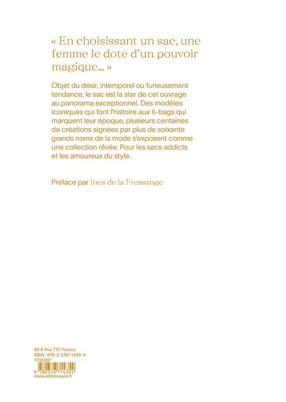 Objet du désir, intemporel ou furieusement tendance, le sac est la star de cet ouvrage au panorama exceptionnel. Des modèles iconiques qui font l’histoire aux it-bags qui marquent leur époque, plusieurs centaines de créations signées par plus de soixante grands noms de la mode s’exposent comme une collection rêvée. Pour les sacs addicts et les amoureux du style.