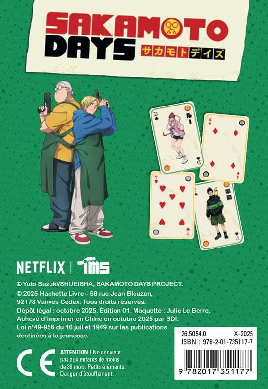 - Un jeu de 54 cartes (52 cartes + 2 jokers) à l’effigie des personnages emblématiques de Sakamoto Days