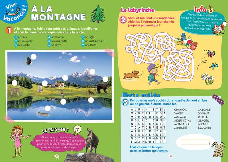 • Des pages « Vive les vacances » remplies de jeux et d’informations documentaires