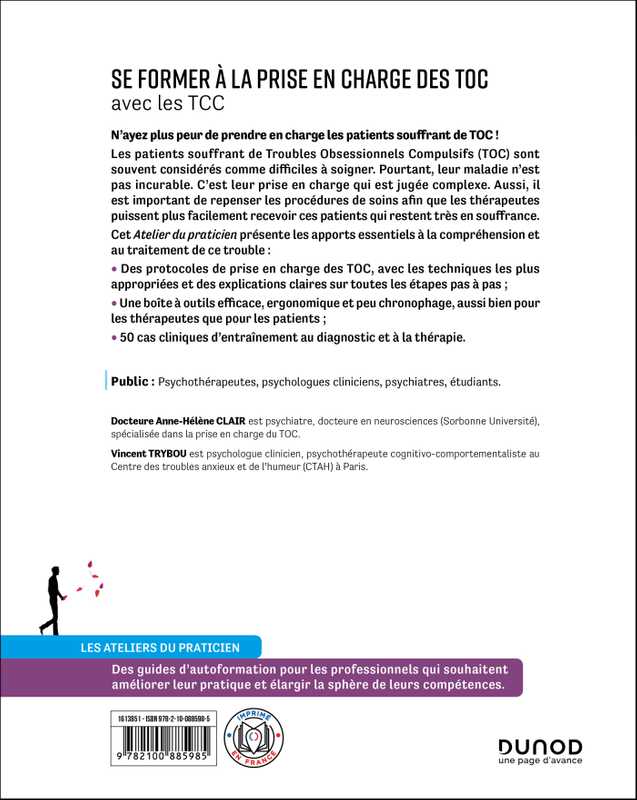 Beaucoup de thérapeutes, formés ou non, rencontrent des difficultés pour prendre en charge les patients souffrant de TOC, qui représentent plus de 3% de la population. C'est pour eux que cet ouvrage a été conçu. En effet, il vise essentiellement la pratique et une prise en main directe, en présentant de nombreuses fiches directement utilisables et de multiples exemples.
