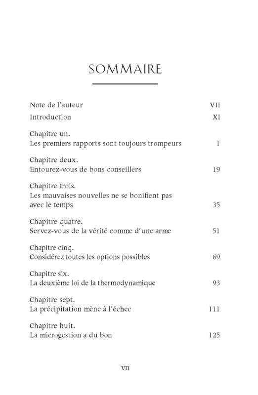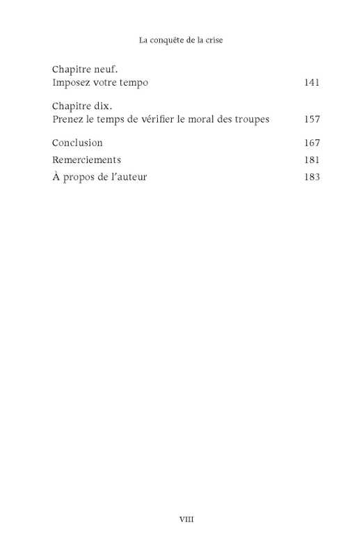 Par des récits personnels inédits et des paraboles riches de sens, il transmet ici ses meilleurs enseignements de leadership. Sa méthode, aussi visionnaire que pragmatique, vous aidera à faire face de manière lucide et efficace dans les moments les plus critiques. N’hésitez plus et suivez pas à pas les cinq phases essentielles pour surmonter les crises : évaluer, rapporter, endiguer, façonner, gérer.