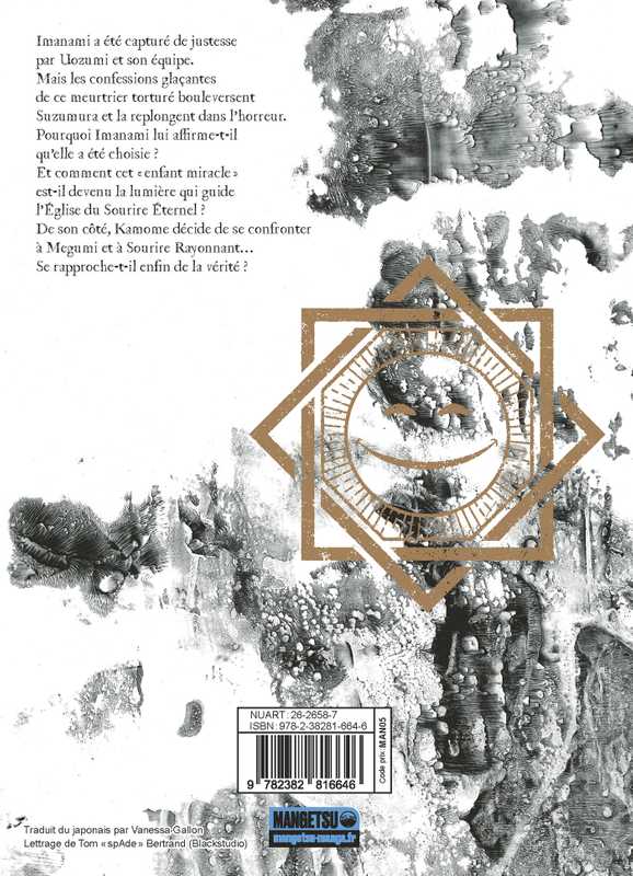Imanami a été capturé de justesse par Uozumi et son équipe. Mais les confessions glaçantes de ce meurtrier torturé bouleversent Suzumura et la replongent dans l'horreur. Pourquoi Imanami lui affirme-t-il qu'elle a été choisie ? Et comment cet « enfant miracle » est-il devenu la lumière qui guide l'Église du Sourire Éternel ?