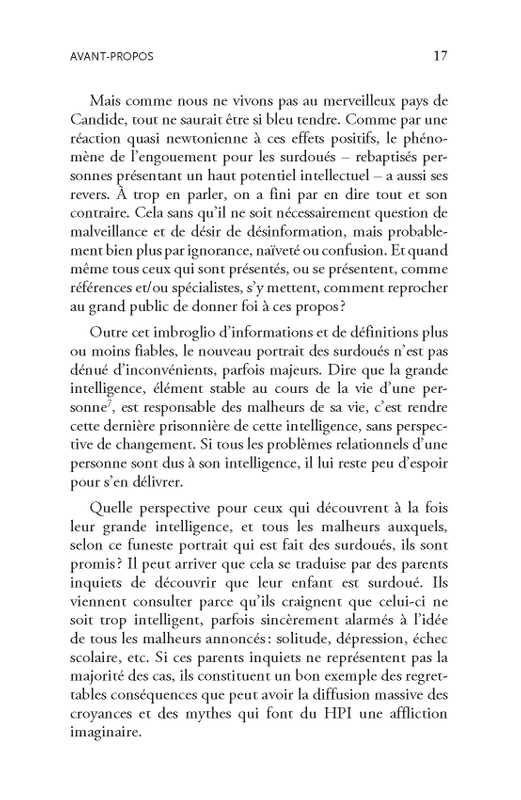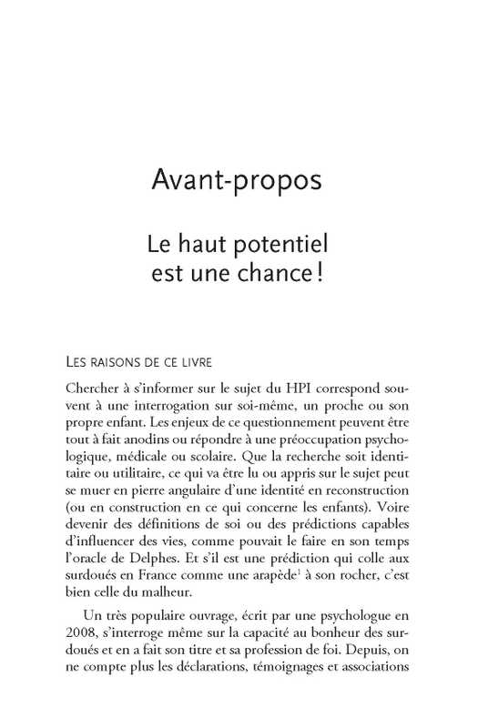 Ce livre qui s’appuie sur de récents travaux de recherche accorde aussi une juste place aux témoignages, notamment ceux de trois adultes surdoués, dont l'un admis en classe de sixième à l’âge de 6 ans, qui ont accepté de raconter leur histoire à travers leurs premiers souvenirs d’enfance, leurs enthousiasmes et leurs déceptions. Autant de façons d’être surdoué et heureux.