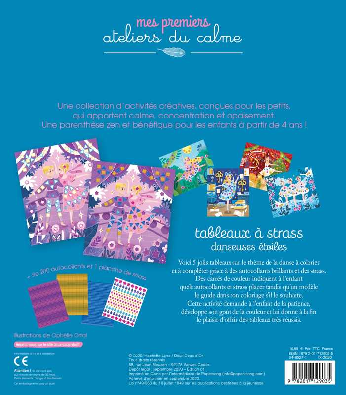 Une boîte contenant 5 tableaux à décorer grâce à 3 planches de stickers brillants et 1 planche de strass en suivant des pas-à-pas et des modèles.